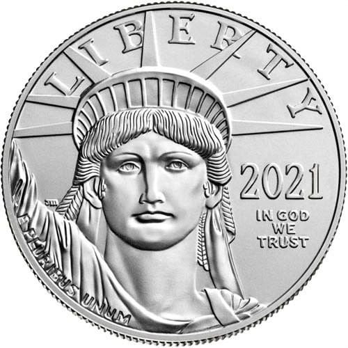 On the obverse side of the 2021 1 oz, American Platinum Eagle Coin is John Mercanti's depiction of Liberty. This design uses the Statue of Liberty for inspiration and focuses on the face of Liberty as she looks out over the Atlantic Ocean toward the horizon as a new day dawns. The coins have inscriptions of Liberty and the date mark, national motto, and E Pluribus Unum.
