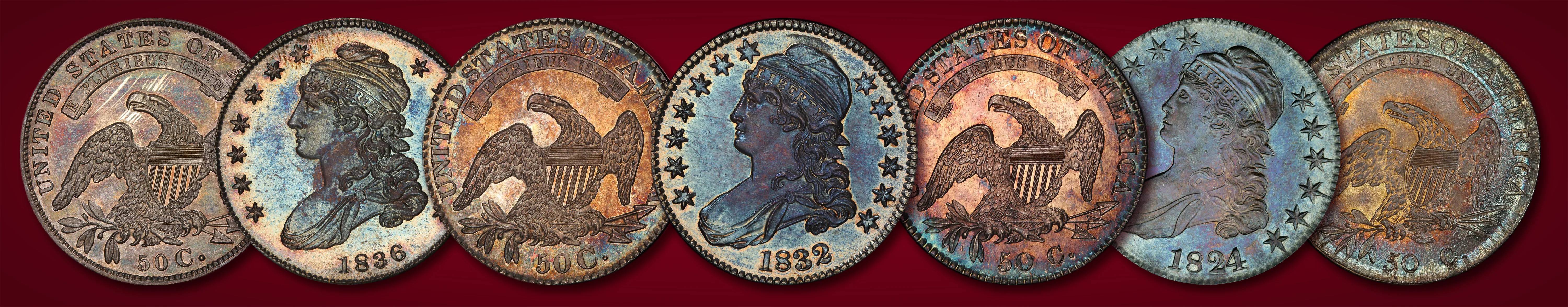 In 1807-1836 the Capped Bust obverse was introduced. Miss Liberty faces left. She wears a cap secured at the base with a ribbon or band inscribed LIBERTY, with tresses falling to her shoulder. Her low neck line is draped in a cloth or a gown and is secured by a brooch on her shoulder. Seven stars are to the left and six are to the right. The date is below. The reverse depicts an eagle perched on an olive branch and holding three arrows, with E PLURIBUS UNUM above on a scroll and UNITED STATES OF AMERICA 50 C. surrounding.