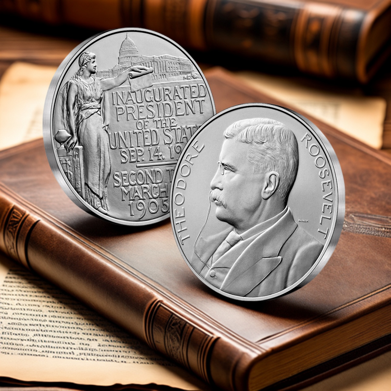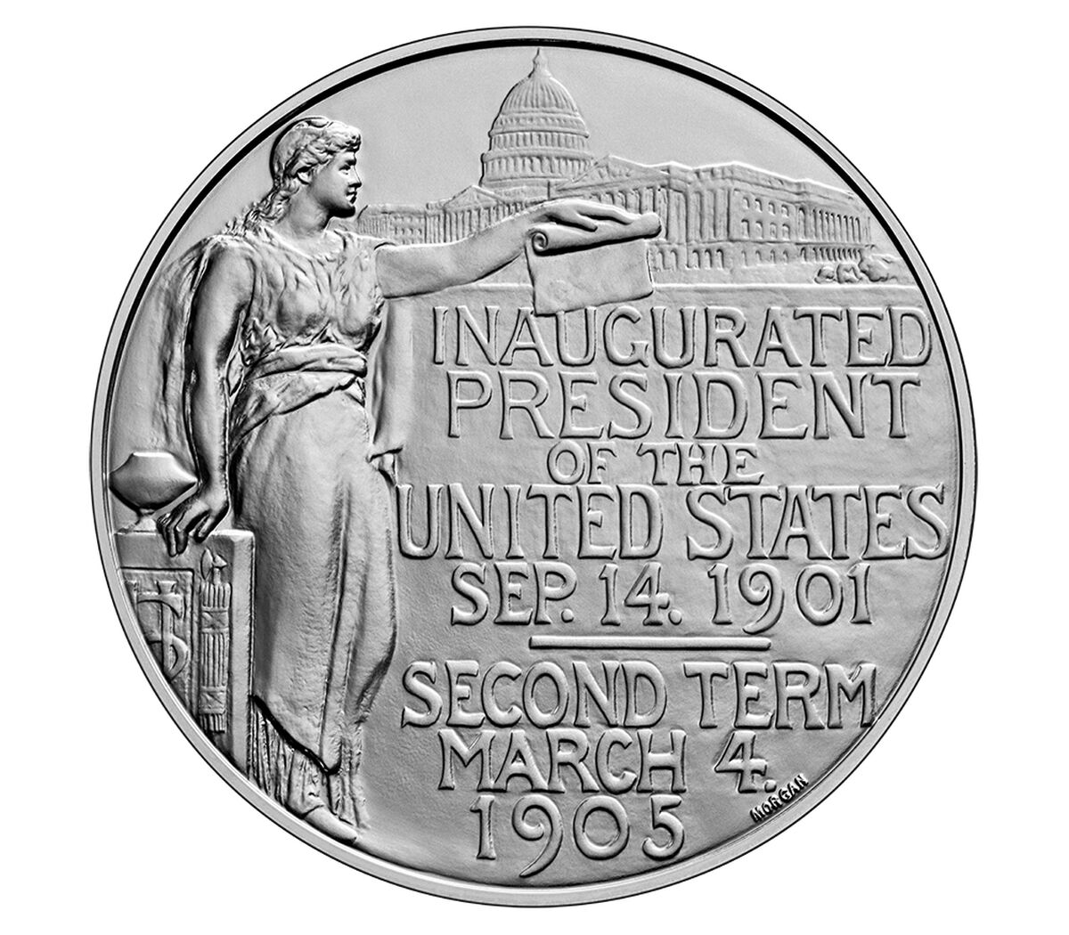 The reverse features the inscriptions “INAUGURATED PRESIDENT OF THE UNITED STATES SEP. 14, 1901,” and “SECOND TERM MARCH 4, 1905.” To the left, Columbia stands with her right hand resting upon a column bearing a cinerary urn and devices symbolizing the authority of the United States. The U.S. Capitol is in the background.